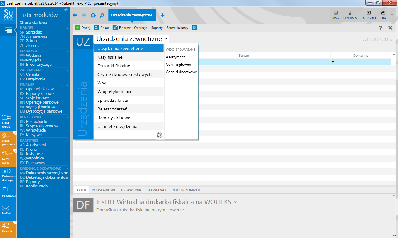 Uwaga! W momencie, gdy w programie jest włączony profil o nazwie Mała firma, moduł Urządzenia jest niewidoczny. Aby go uruchomić, należy zaaplikować ustawienia Pełne lub w konfiguracji profilu włączyć obsługę danego urządzenia. Informację dotyczącą konfiguracji sposobu wyświetlania modułów można naleźć tutaj.